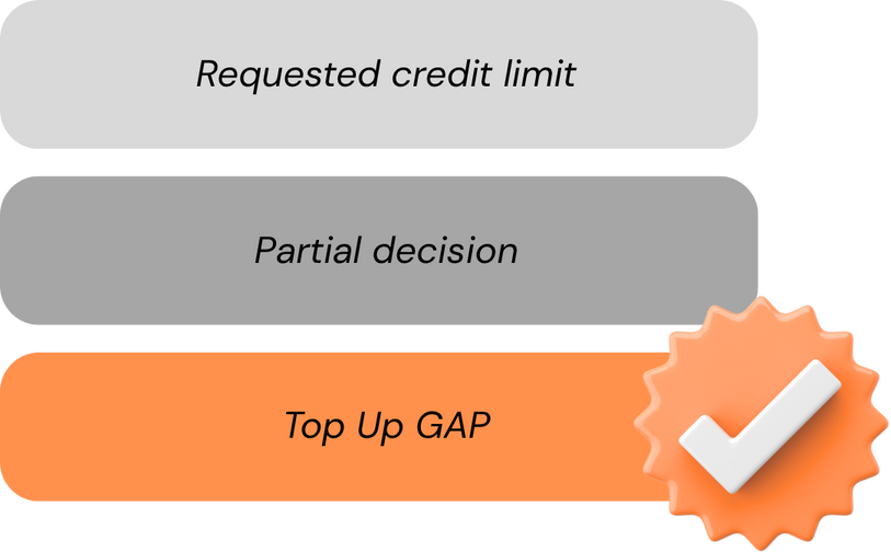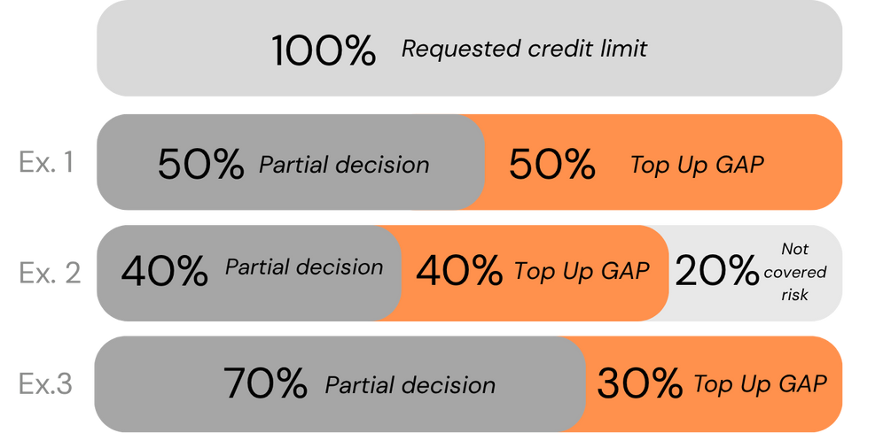 The Top Up coverage can provide full coverage if your credit insurer approves at least 50% of your requested credit limit. For example, if you receive 40% of your desired credit limit, we will match this amount, but will not exceed it. In this case, you will still have obtained 80% of the amount you originally applied for.